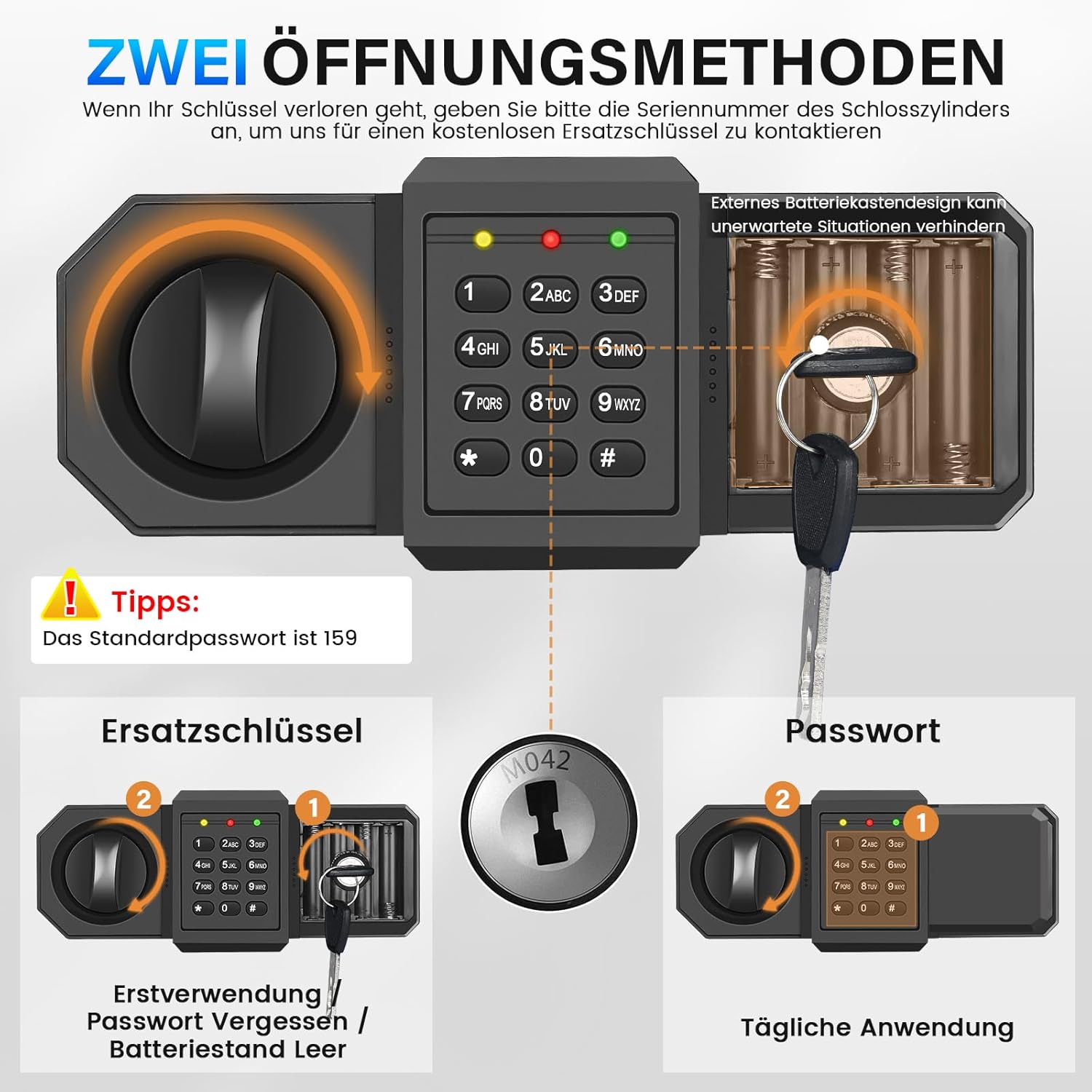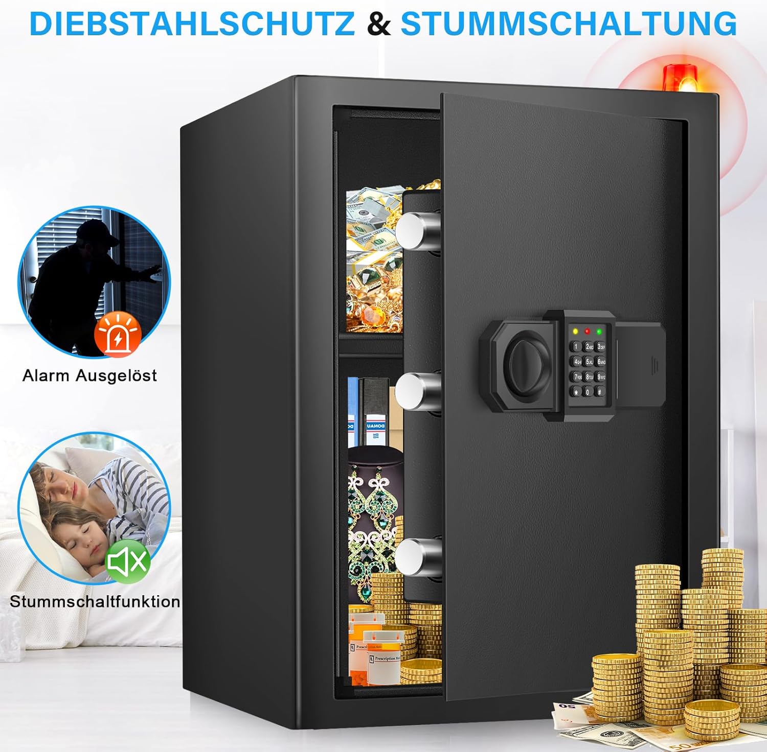 Safe with a combination lock and key: Our safe comes with a 3-8 digit numeric password and a spare key that allows you to easily set custom passwords for opening the safe in daily use. The keyboard is responsive and backlit so it is easy to use even in low light conditions. If you forget your password, you can also use a spare key to open the safe and reset the password.