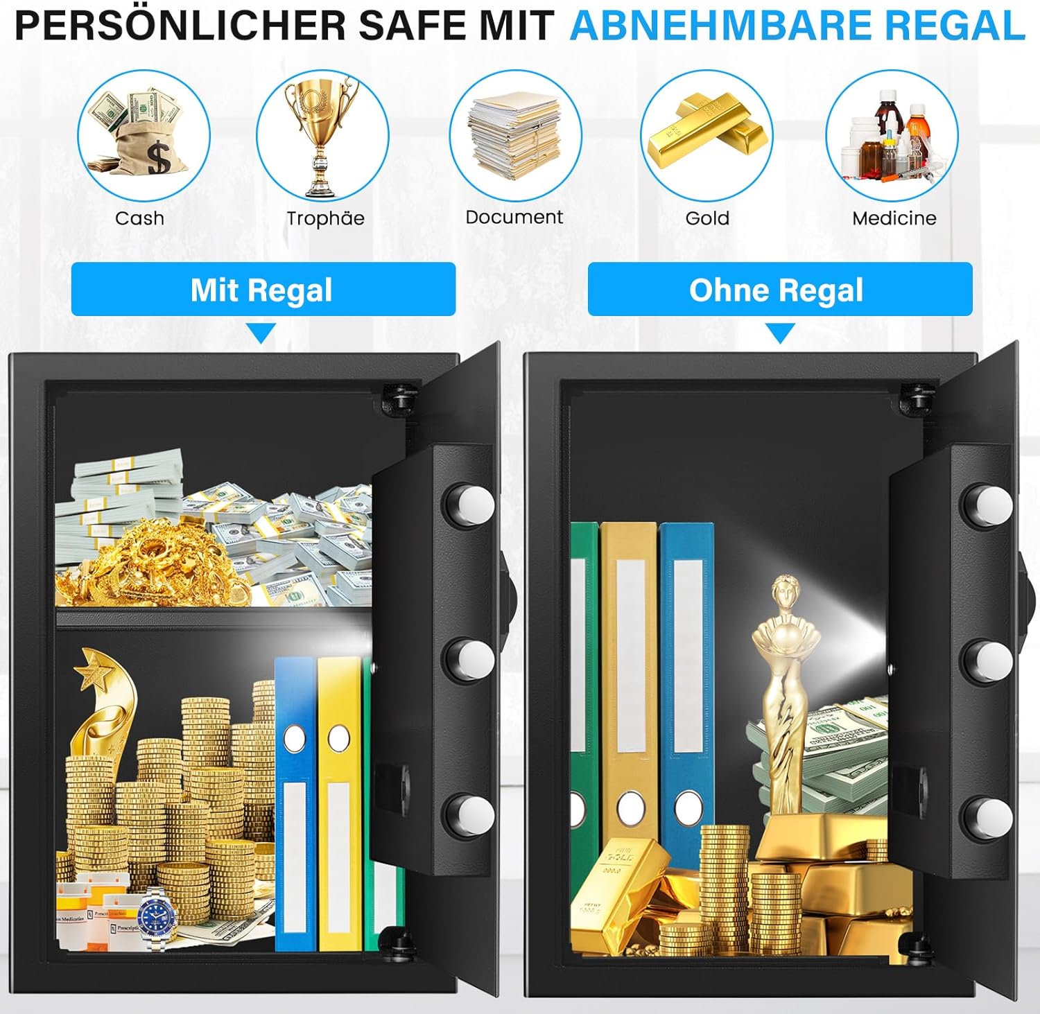 Removable shelf and sensor light: A removable shelf inside the mini safe can help you store items of different sizes, making it convenient for you to store and organise important items. You can use it according to your own needs. A built-in induction light automatically lights up when the safe is opened and provides lighting even in low light conditions.