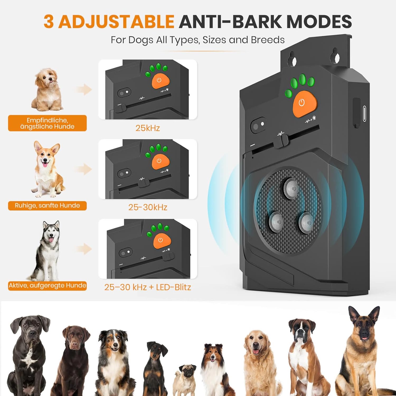 Antibarking for Dogs, Ultrasonic Device Dogs, Anti Bark Device Dogs with 3 Modes, 15 m Range, Automatic Anti Bark Function, Ultrasonic Dog Bark Stopper for Indoor and Outdoor Use