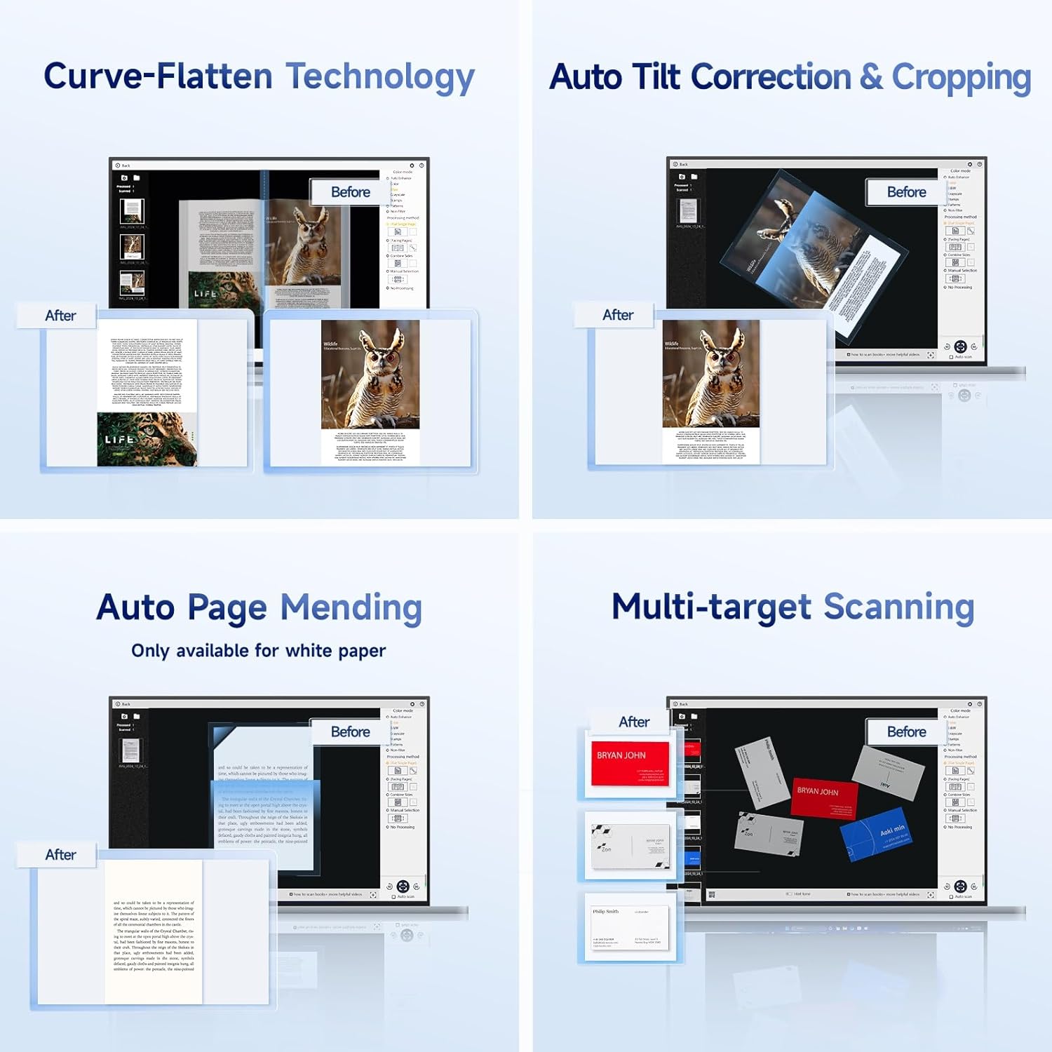 With our patented curve flatten technology, auto focus and automatic page detection, it scans books even faster with incredible 1 second per page, so scanning an entire book takes only a few minutes