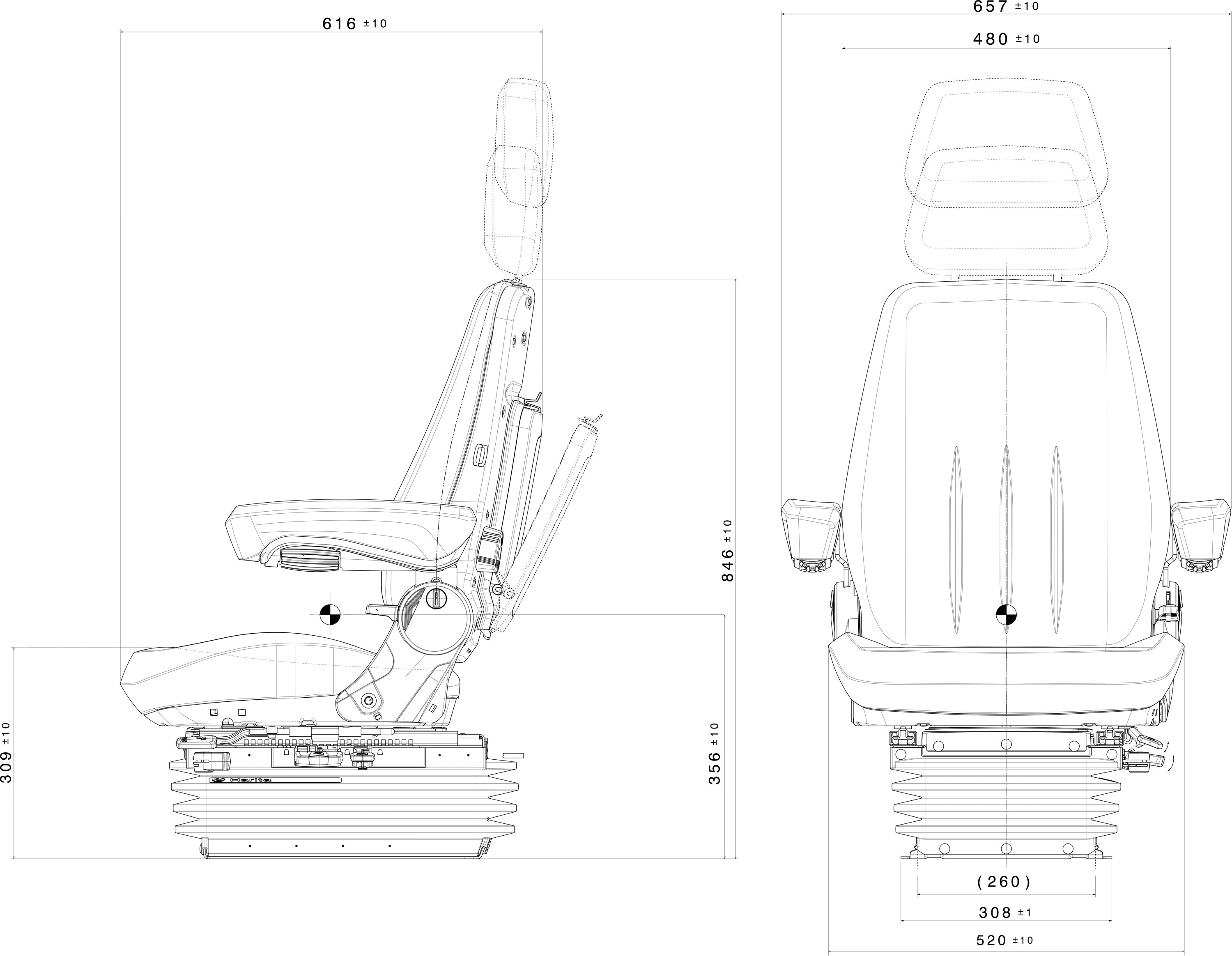 Heavy-Duty Air Suspension – 24V pneumatic suspension with 120 mm travel and 80 mm height adjustment for operators weighing 50–135 kg.