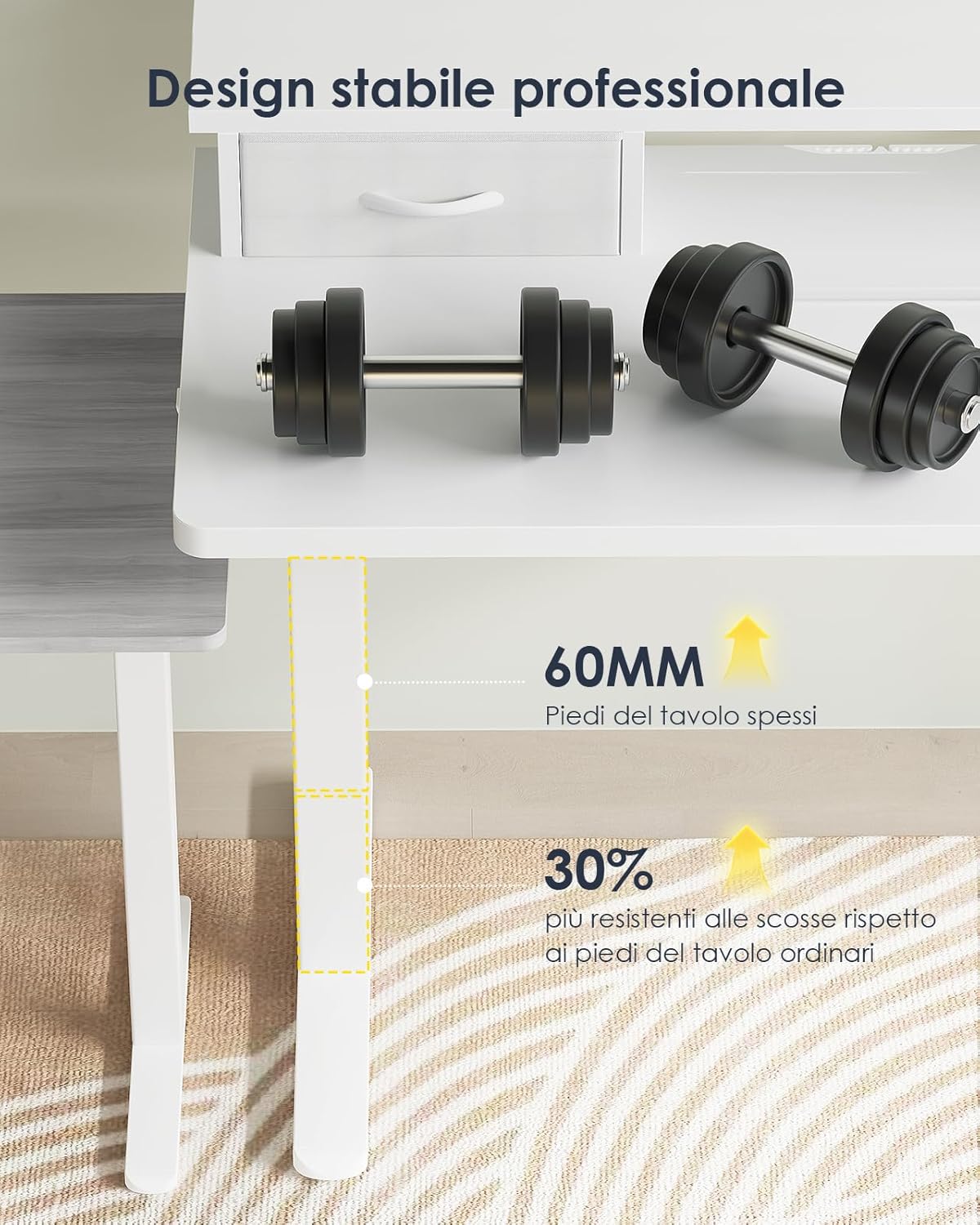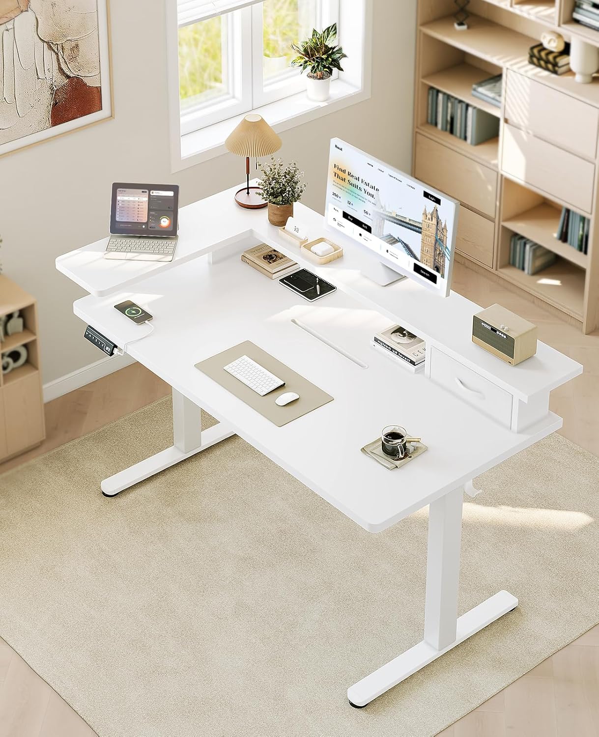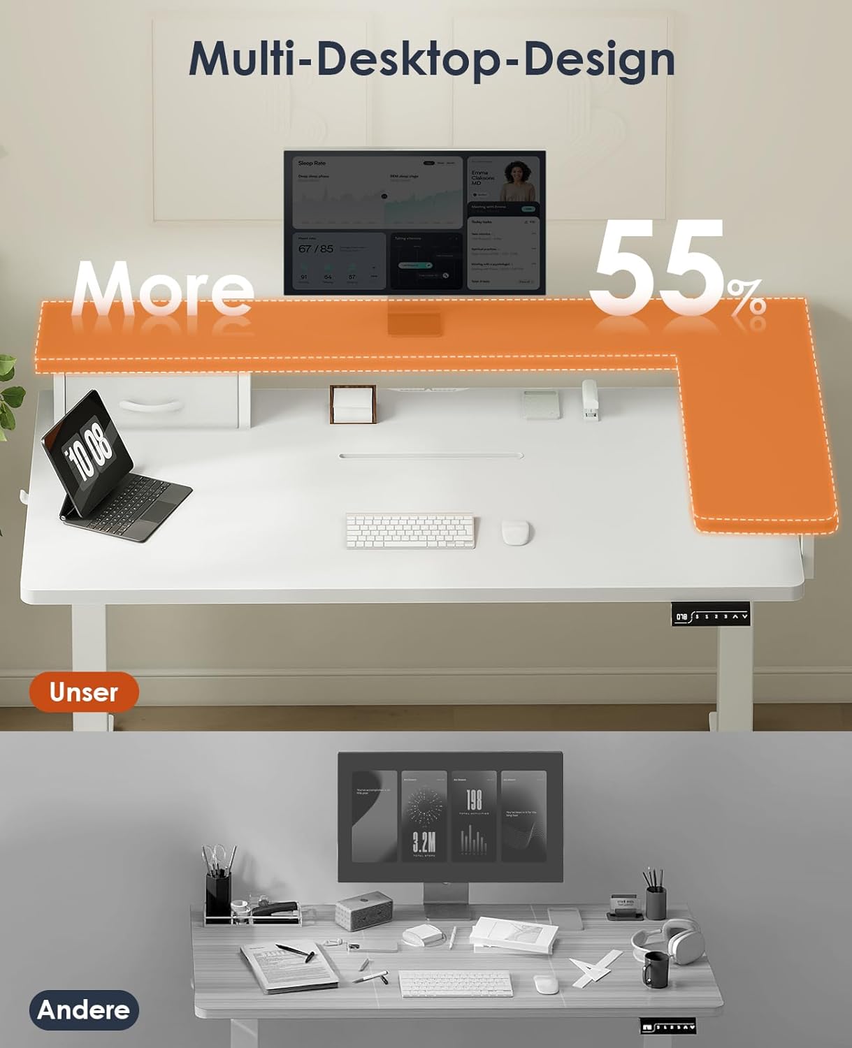 MULTI-TERED SPACE The double layer desk provides 55% more storage space, while the L-shaped bracket provides extra space for monitors and more storage space under the desk, effectively relieving neck tension.
