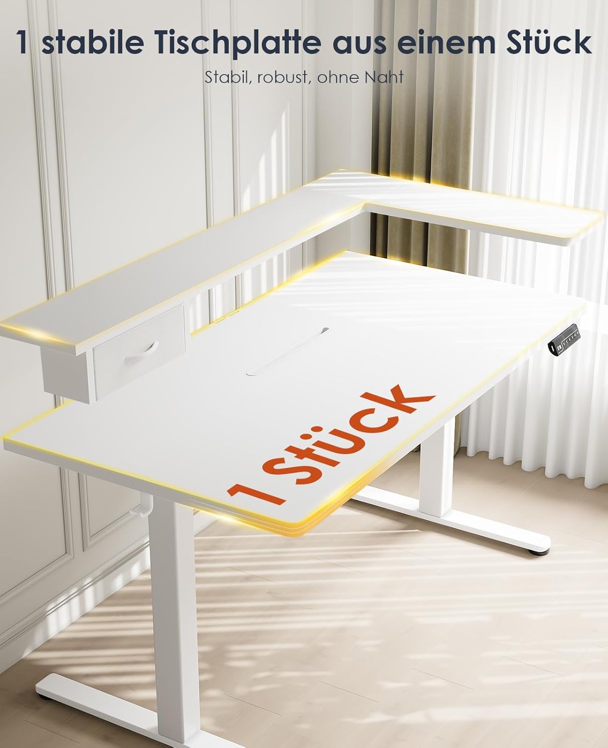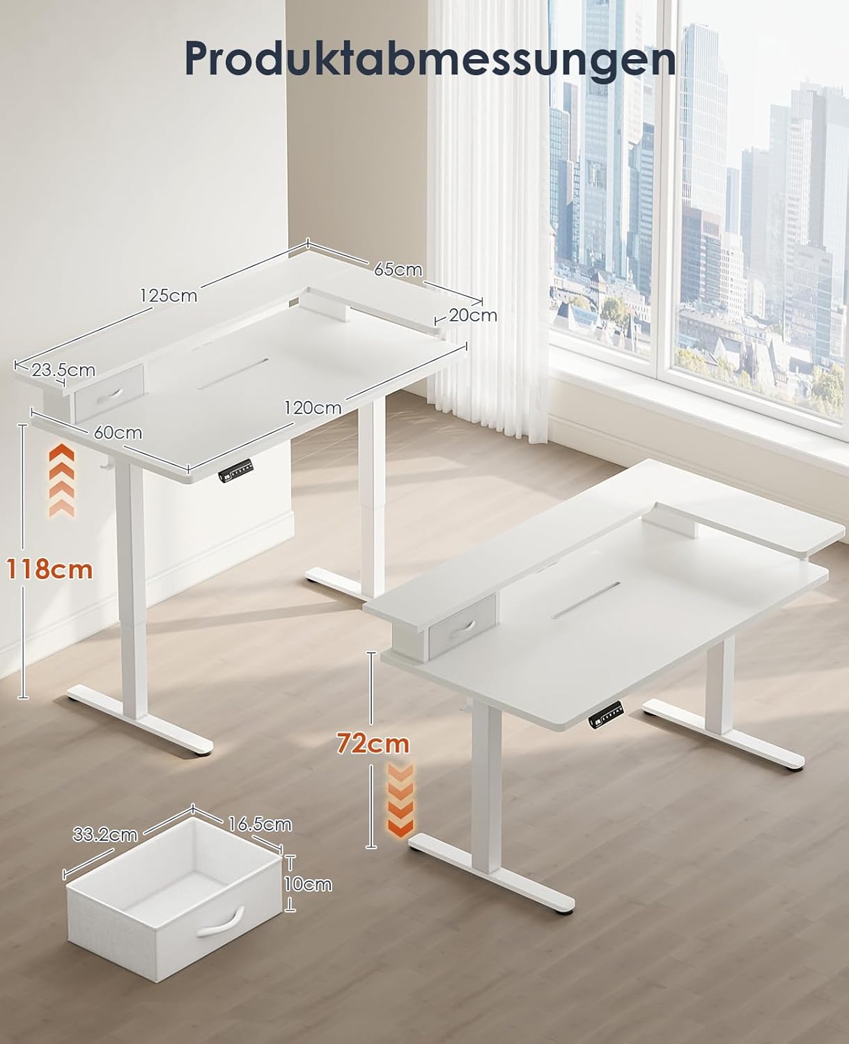 Vertical storage space: desk height adjustable electric with a fabric drawer for small items that eliminates desk clutter and maximises vertical space use for clear storage, avoiding a crowded desk.