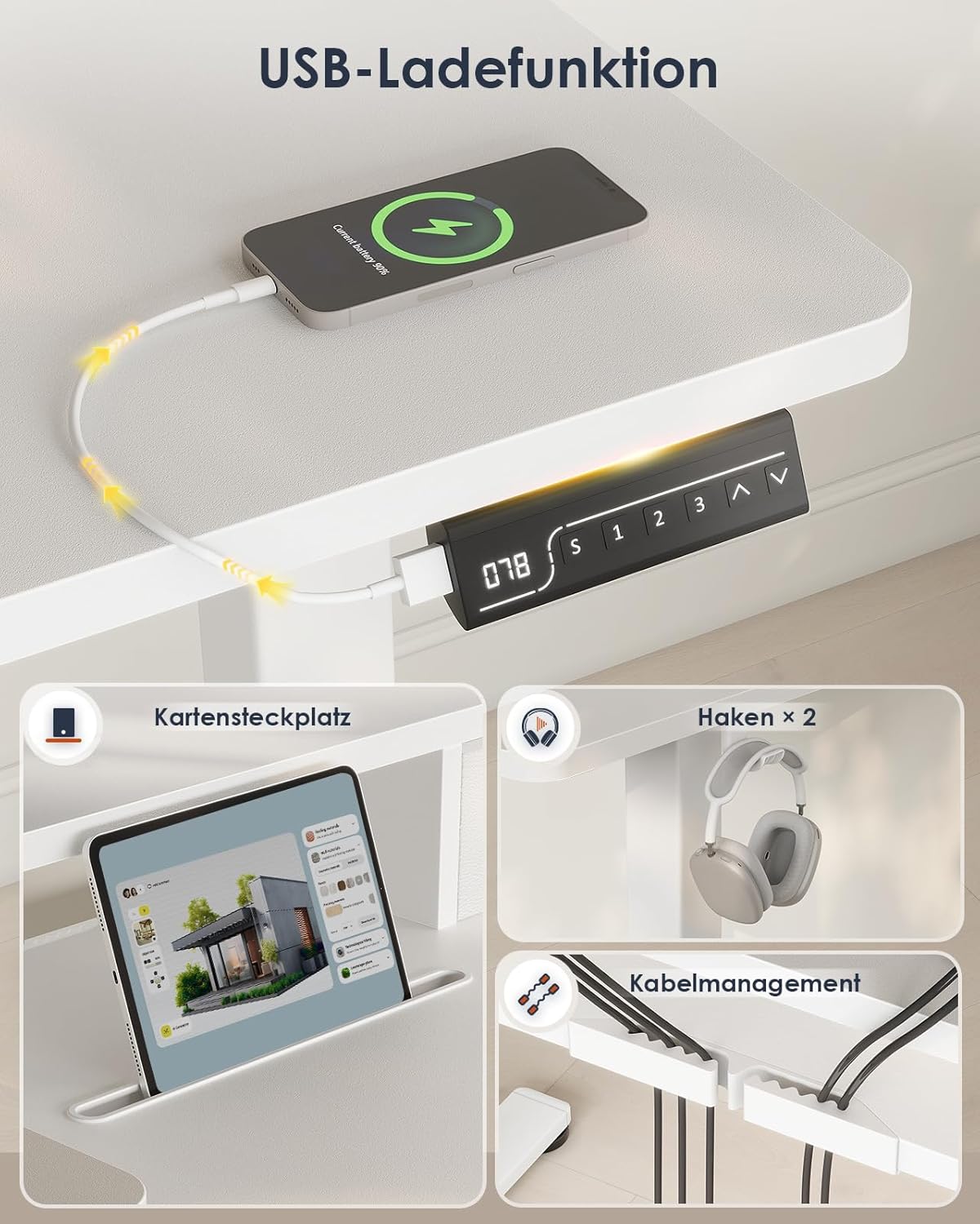 USB ports and cable management: USB ports allow you to charge your smartphone, headphones, your and other devices. The cable management tools on the back of the adjustable table efficiently organise the cables of multiple monitors and computers, ensuring a tidy working environment.