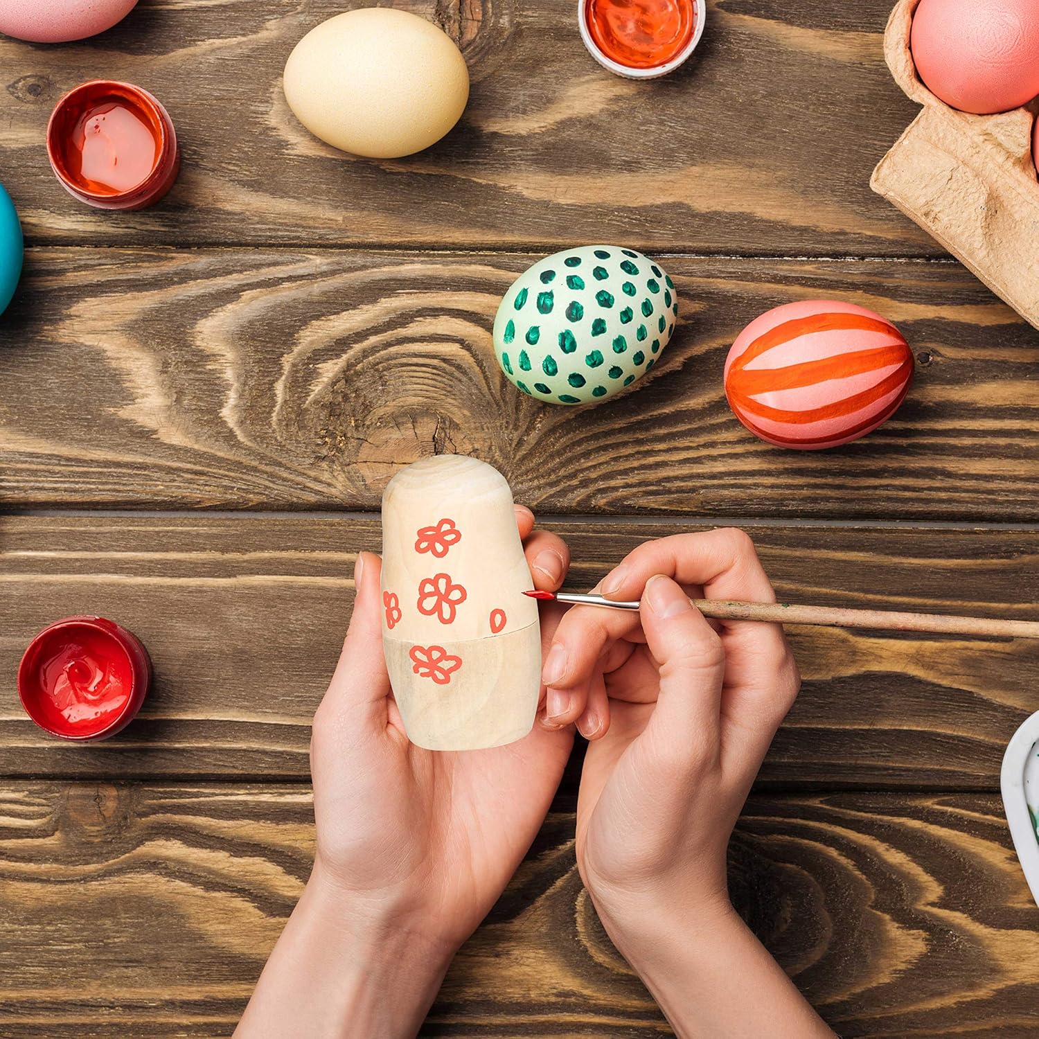 Diese Nistpuppen haben 5 verschiedene Größen und passen perfekt ineinander. Die Holzpuppen ergänzen jede Art von Einrichtung in Ihrem Zuhause. Diese Nistpuppen sind von traditionellen russischen Kunstwerken inspiriert, die aus einem einzigen Stück Holz geschnitten und später in Stücke zerlegt wurden.